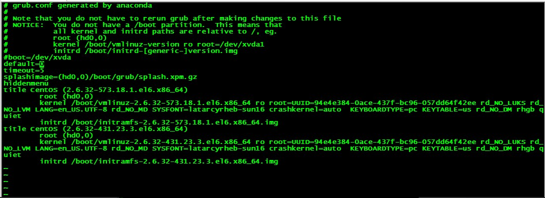(2) 在 grub.conf 文件中决定开机使用哪个内核版本做启动的参数是 default,默认为 0(代表从最新的内核启动,代表的内核版本从上往下依次是 0,1, 2 等)。