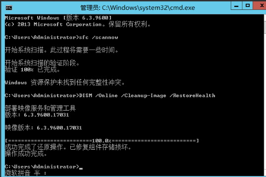在 “命令提示符” 窗口中,键入以下命令,然后按 Enter。 完成命令操作可能需要几分钟时间。