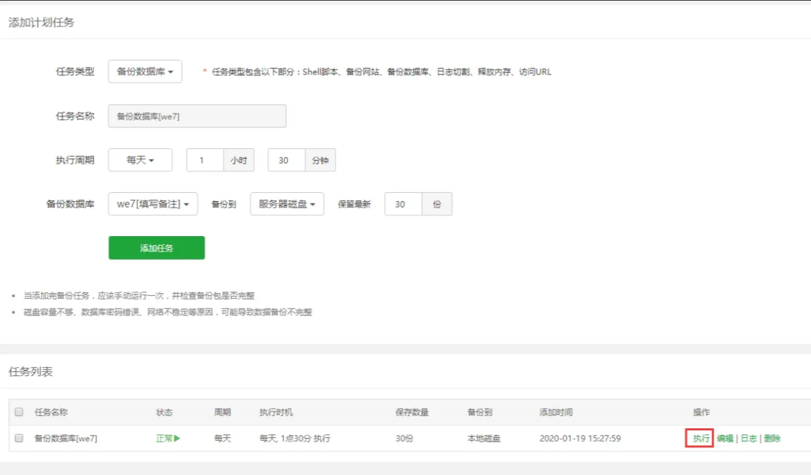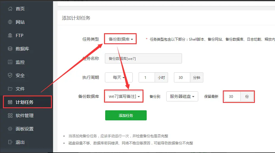 1、登录宝塔面板,打开【计划任务】,任务类型选择【备份数据库】,设置备份周期,如【每天】,选择需要备份的数据库,每天备份的话,建议保留最新【30份】,点击【添加任务】