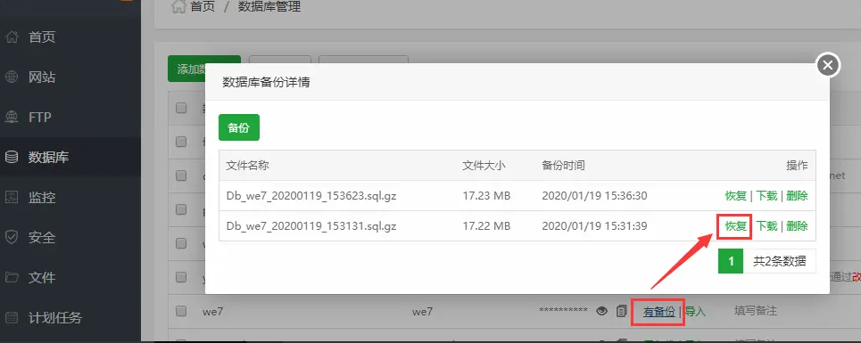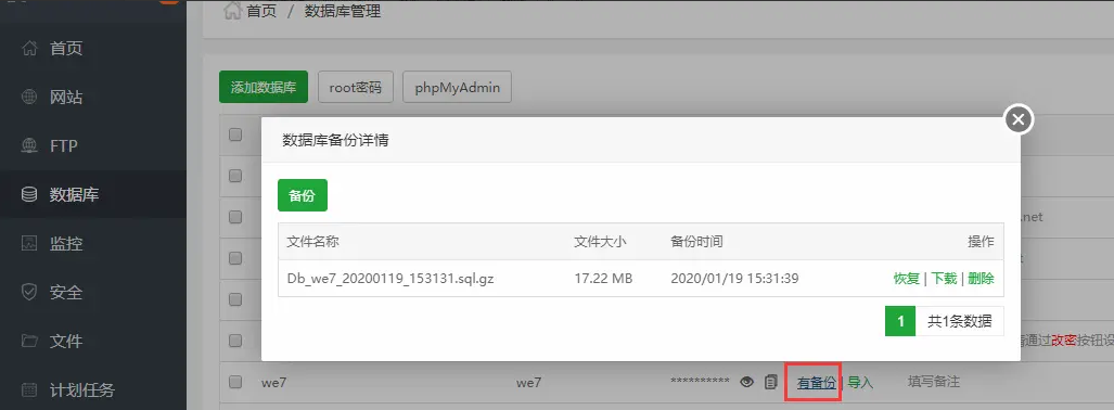 3、打开数据库管理页面,查看数据库备份文件是否创建成功,以及数据库大小是否异常,一般几B或几K的数据库大小是有问题的,可再次手动执行备份。