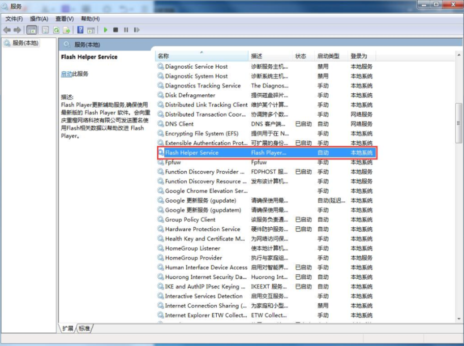 2、在服务中,我们找到Flash Helper Service服务,并双击进入