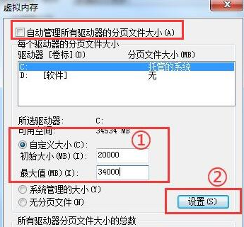 5、进入后,先取消“自动管理所有驱动器的分页文件大小”