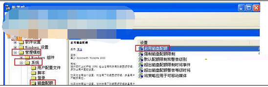 3. 在打开的组策略窗口左边依次展开:“计算机配置”—“管理模板”—“系统”—“磁盘配额”选项。