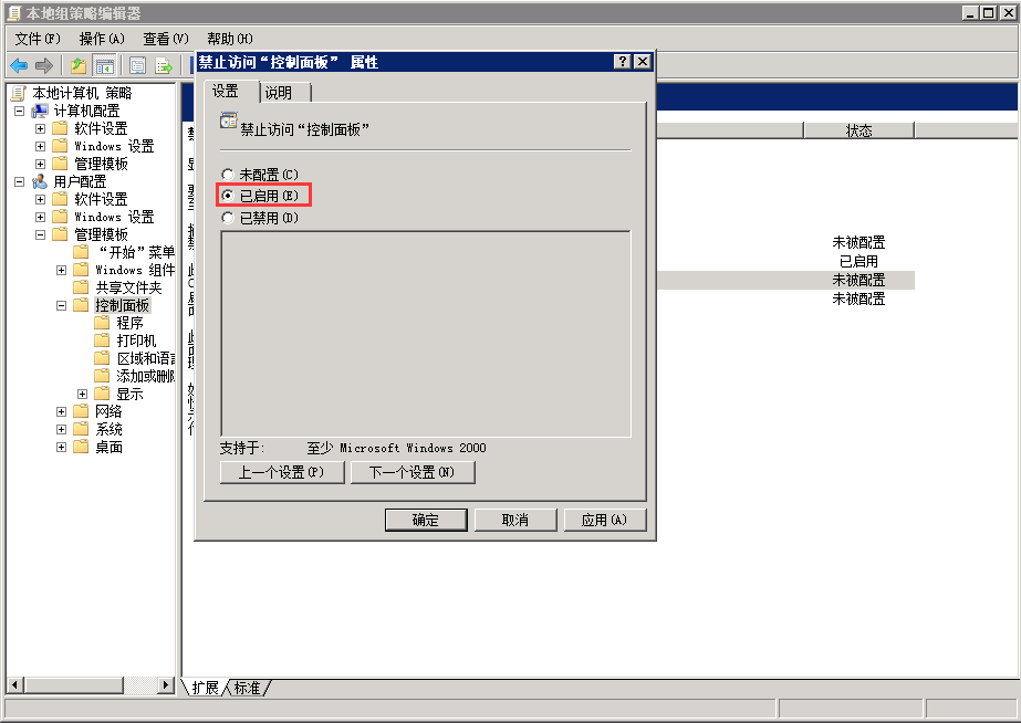 3、打开”禁止访问“控制面板””,查看设置为了”已启用”,将其改为“未配置”,点击确定,然后再查看控制面板就显示出来了。