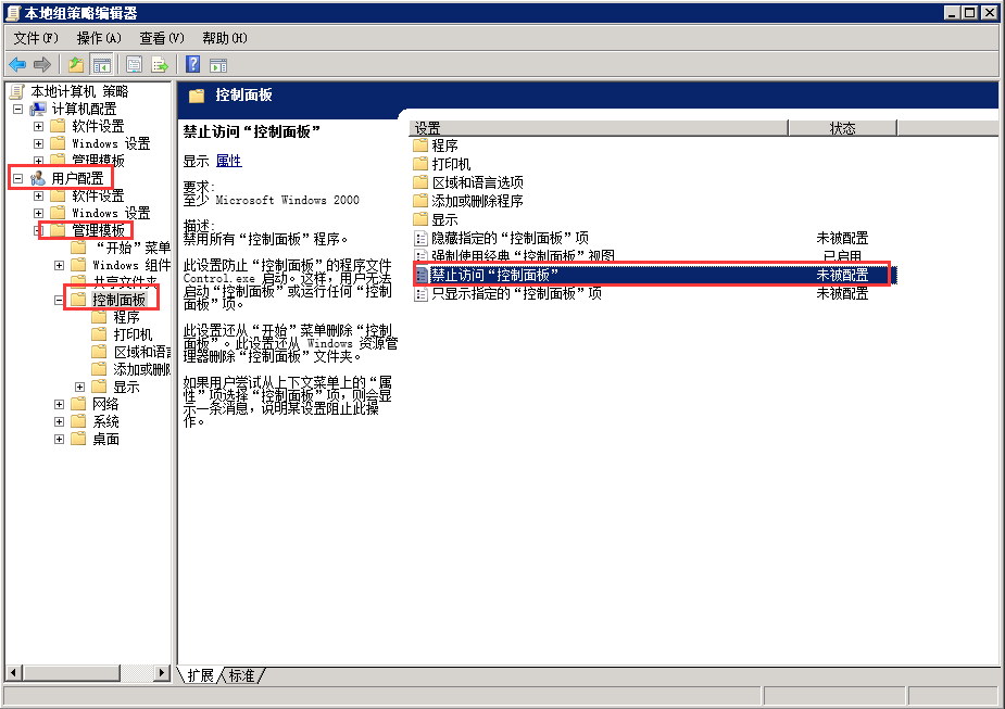 2、点击用户配置-管理模版-控制面板-右侧找到”禁止访问“控制面板””。